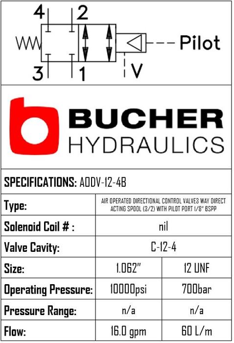 AODV-12-N-4B • PILOT DIRECTIONAL CONTROL VALVE AIR OPERATED 4-WAY (4/3) SPOOL B TYPE • C-12-4 • 350 BAR • 76 LPM • BUCHER