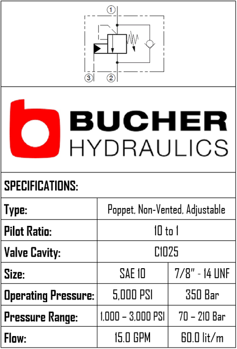 CBPP-10-N-S-0-10-30-A • COUNTERBALANCE VALVE LOAD HOLDING 4:1 PILOT • C-10-25 • 350 BAR (SET 21-210 BAR) • 60 LPM • BUCHER