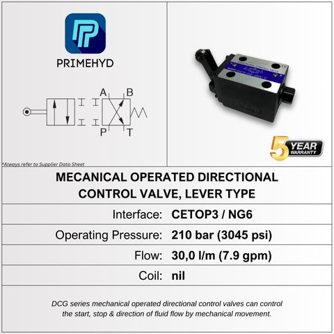 MECHANICAL OPERATED DIRECTIONAL CONTROL VALVE, PUSH TYPE, CETOP 03 (NG6), PRESSURE 210 BAR, FLOW 30 L/MIN, COIL NIL, BRAND: PRIMEHYD
