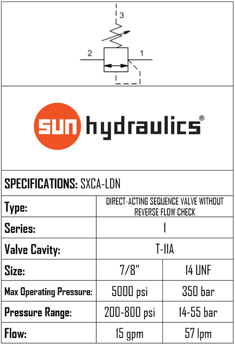 SXCA-LDN • PRESSURE SEQUENCE VALVE DIRECT ACTING WITHOUT REVERSE FLOW CHECK • T-11A • 350 BAR (14–55 BAR) • 57 LPM • SUN