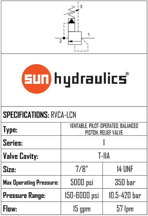 RVCA-LCN • RELIEF VALVE • PILOT OPERATED • BALANCED PISTON • VENTABLE TYPE • T-11A • 350 BAR (SET 10.5–420 BAR) • 57 L/MIN • SUN HYDRAULICS