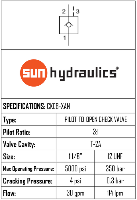 CKEB-XAN • CHECK VALVE, PILOT TO OPEN • 0.3 BAR • T-2A • 350 BAR • 114 LPM • SUN