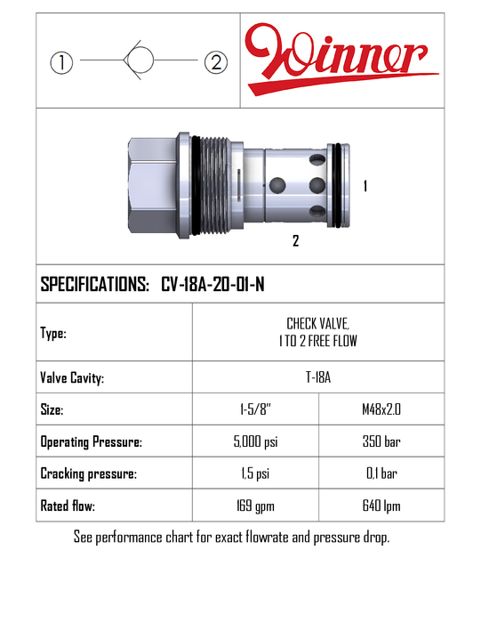 CV18A2001N-WN • CHECK VALVE 1 TO 2 FREE FLOW • 0.1 BAR • T-18A • 350 BAR • 640 LPM • WINNER