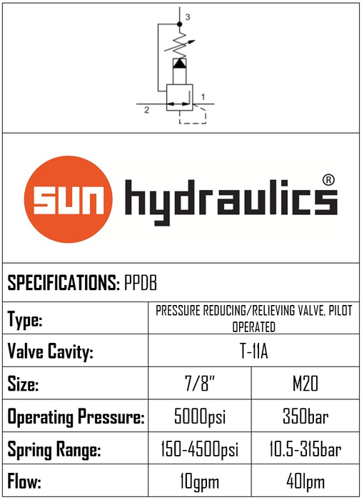 PPDB8WN • PRESSURE REDUCING/RELIEVING VALVE PILOT OPERATED MAIN STAGE • T-11A • 350 BAR • 40 LPM • SUN