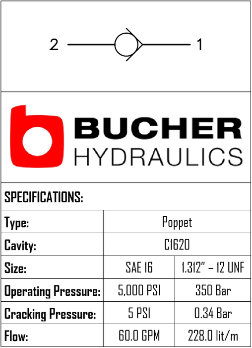 CVFP-16-N-0-005 • CHECK VALVE FORWARD GUIDED POPPET • 0.34 BAR • C-16-2 • 350 BAR • 228 LPM • BUCHER