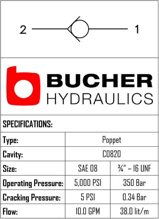 CVRP-08-N-0-005 • CHECK VALVE REVERSE GUIDED POPPET • 0.34 BAR • C-8-2 • 350 BAR • 38 LPM • BUCHER
