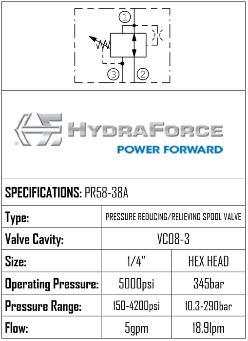 PRESSURE REDUCING/RELIEVING VALVE SPOOL, CAVITY MANIFOLD, PORT SIZE SAE-8, 0 TO 210 BAR, 38 L/MIN (10 GPM), HYDRAFORCE