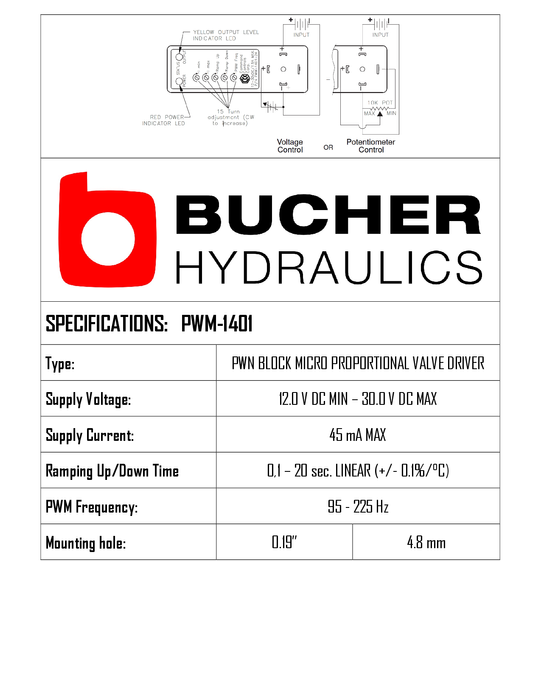 PROPORTIONAL VALVE DRIVER, DUAL OUTPUT, 24 V DC SUPPLY, CLOSED LOOP CURRENT CONTROL, FRONT PANEL RAMP AND DITHER ADJUSTMENT, LED STATUS INDICATORS, BRAND BUCHER HYDRAULICS
