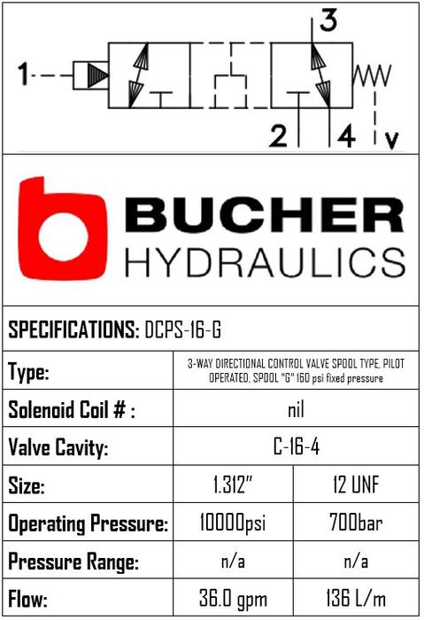 DCPS-16-N-G-F-0-160 • PILOT DIRECTIONAL CONTROL VALVE 3-WAY SPOOL G TYPE • C-16-4 • 350 BAR • 136 LPM • BUCHER