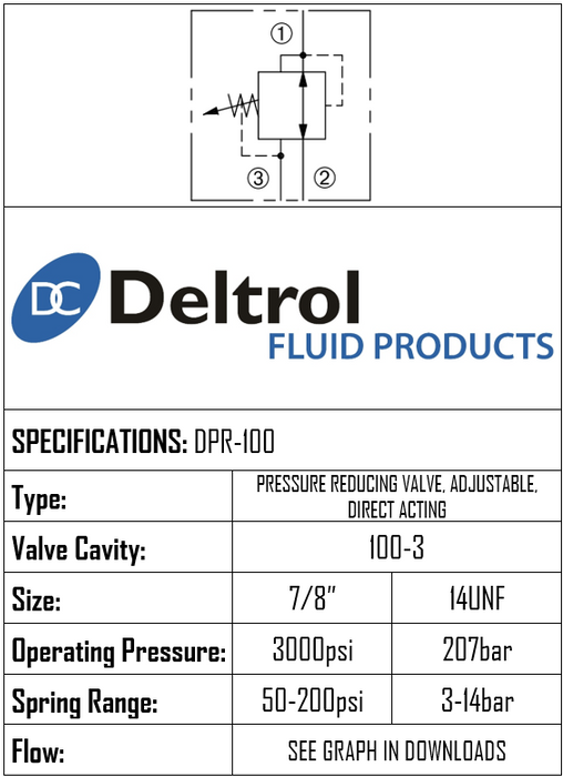 DPR100NS2 • PRESSURE REDUCING/RELIEVING VALVE DIRECT ACTING • 100-3 • 207 BAR (3–166 BAR) • 15 LPM • DELTROL