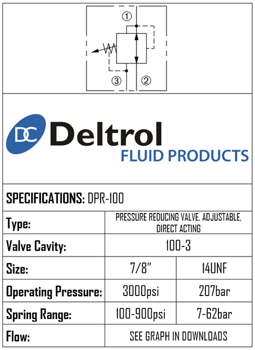 DPR-100-N-S-9 • PRESSURE REDUCING/RELIEVING VALVE DIRECT ACTING • 100-3 • 207 BAR (7–62 BAR) • 15 LPM • DELTROL
