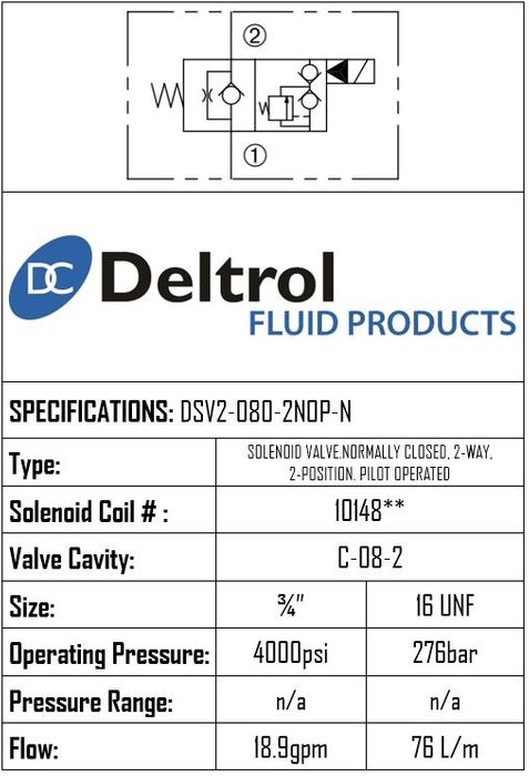 DSV2-080-2NOP-N • SOLENOID VALVE 2-WAY 2-POSITION NORMALLY OPEN POPPET TYPE • C-8-2 • 207 BAR • 76 LPM • DELTROL