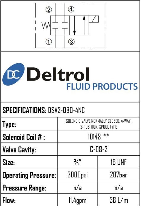 DSV2-080-4NC • SOLENOID VALVE 4-WAY 2-POSITION SPOOL TYPE • C-8-2 • 207 BAR • 76 LPM • DELTROL