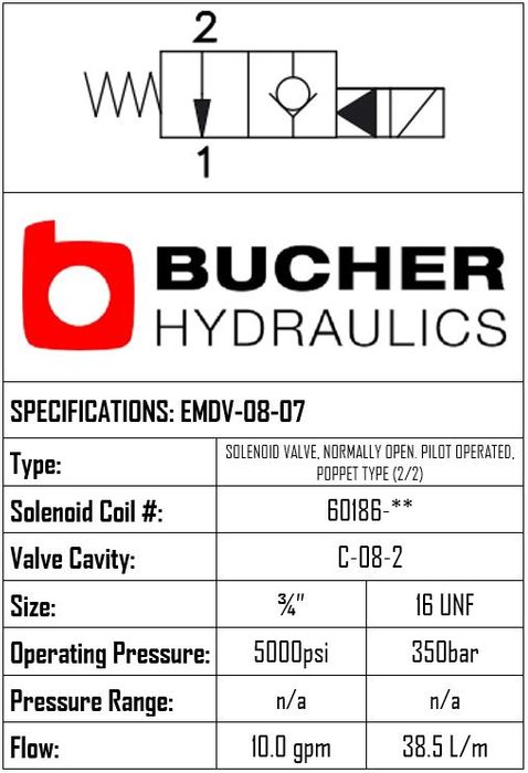 • EMDV-08-N-07-0-00 • SOLENOID VALVE 2-WAY 2-POSITION NORMALLY OPEN SPOOL TYPE • C-8-2 • 350 BAR • 19 LPM • BUCHER