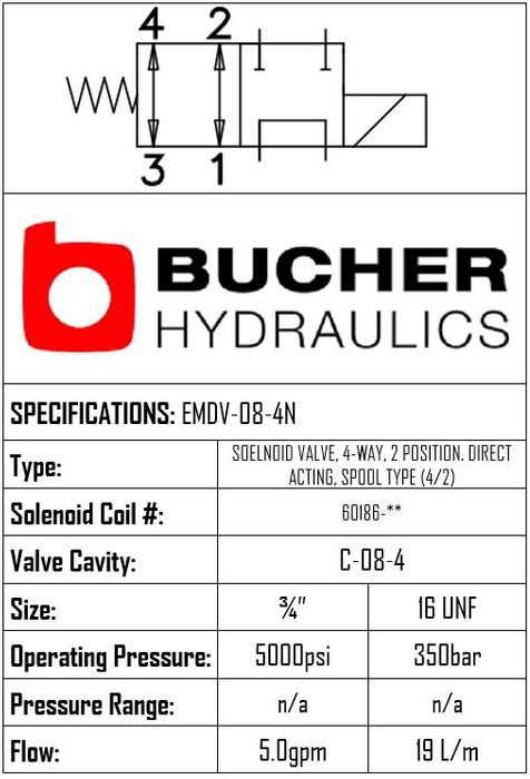EMDV-08-N-4N-0-00 • SOLENOID VALVE 4/2 DIRECT ACTING, SPOOL TYPE • C-8-4 • 350 BAR • 19 LPM • BUCHER