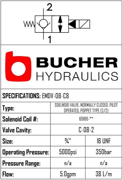 EMDV-08-N-C8-0-00 • SOLENOID VALVE 2/2 NORMALY CLOSED, PILOT OPERATED, POPPET TYPE • C-8-2 • 350 BAR • 38 LPM • BUCHER