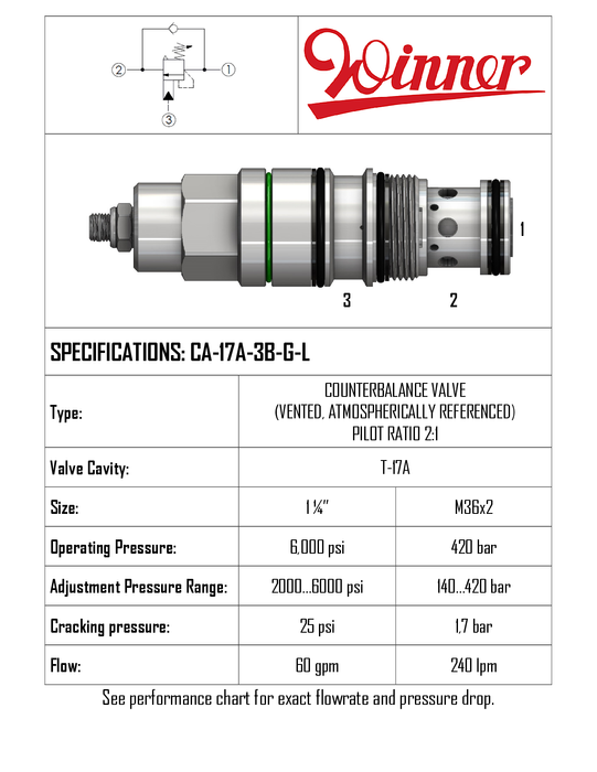 CA17A3BGL • COUNTERBALANCE VALVE 2:1 PILOT RATIO • T-17A • 420 BAR (SET 140-420 BAR) • 240 LPM • WINNER