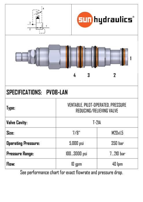 PVDB-LAN • PRESSURE REDUCING/RELIEVING VALVE VENTABLE PILOT OPERATED • T-21A • 350 BAR (7–210 BAR) • 40 LPM • SUN