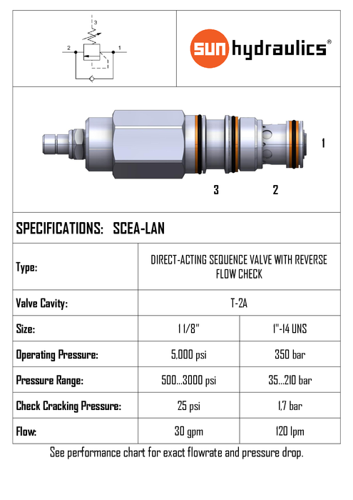 SCEA-LAN • PRESSURE SEQUENCE VALVE DIRECT ACTING WITH REVERSE FLOW CHECK • T-2A • 350 BAR (35–210 BAR) • 120 LPM • SUN