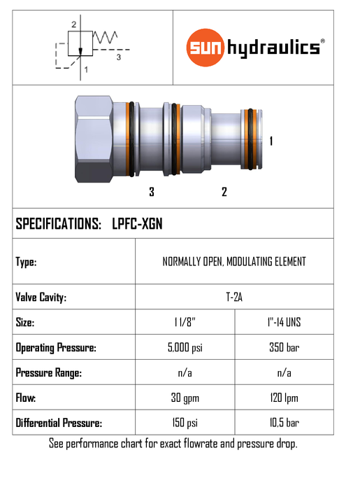 LPFC-XGN • PRESSURE REDUCING VALVE NORMALLY OPEN MODULATING ELEMENT • T-2A • 350 BAR • 120 LPM • SUN