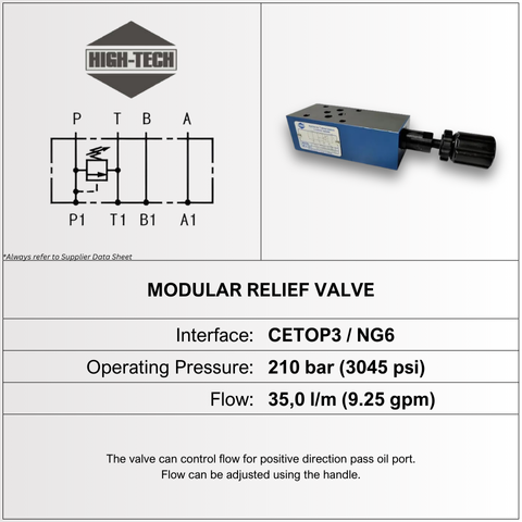 RV-02M-P-3-A • MODULAR RELIEF VALVE • PORT P • CETOP 03 / NG6 • MAX PRESSURE 210 BAR • FLOW CAPACITY 35 L/MIN • HIGH-TECH