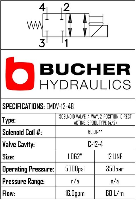 EMDV-12-N-4B-0-00 • SOLENOID VALVE 4/2, DIRECT ACTING, SPOOL TYPE • C-12-4 • 350 BAR • 60 LPM • BUCHER