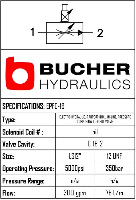 EPFC-16-N-05-0-M-0 • PROPORTIONAL PRESSURE REDUCING/RELIEVING VALVE PILOT OPERATED SPOOL TYPE • C-16-2 • 350 BAR • 76 LPM • BUCHER