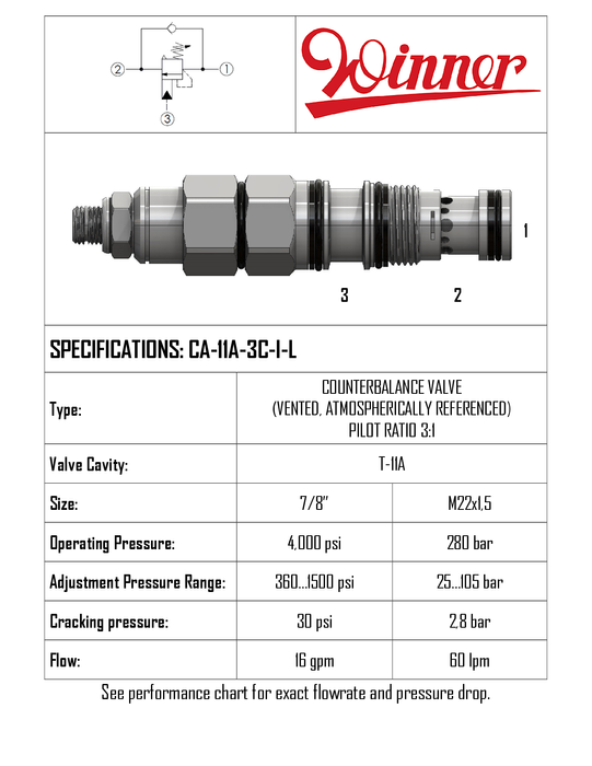 CA11A3CIL • COUNTERBALANCE VALVE LOAD HOLDING 3:1 PILOT • T-11A • 280 BAR (SET 25-105 BAR) • 60 LPM • WINNER