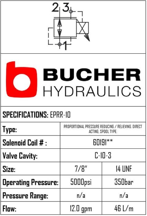 EPRR-10-N-10-0-M-00 • PROPORTIONAL PRESSURE REDUCING/RELIEVING VALVE DIRECT ACTING • C-10-3 • 350 BAR (0–69 BAR) • 3.8 LPM • BUCHER