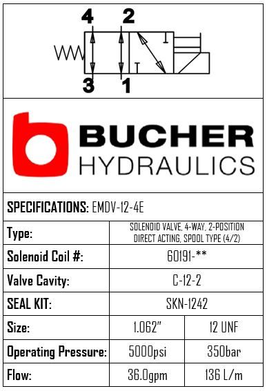 EMDV-12-N-4E-0-00 • SOLENOID VALVE 4/2 DIRECT ACTING, SPOOL TYPE • C-12-4 • 350 BAR • 60 LPM • BUCHER