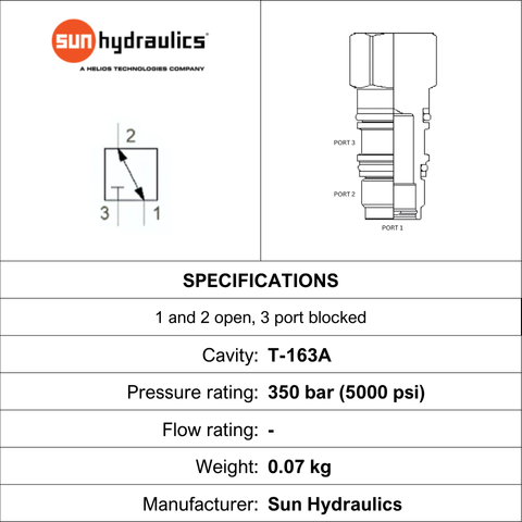 XZOB-XXN • CAVITY PLUG PORT 1 AND 2 OPEN, PORT 3 BLOCKED • T-163A • 350 BAR • SUN HYDRAULICS