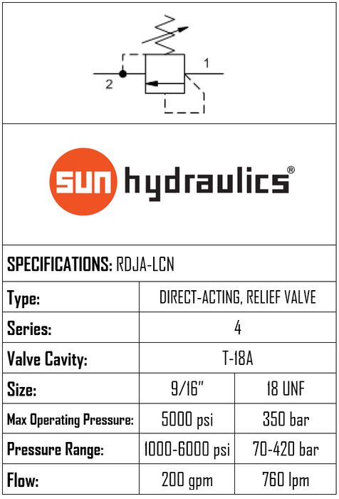 RDJA-LCN • RELIEF VALVE • DIRECT ACTING • POPPET TYPE • T-18A • 350 BAR (SET 10–420 BAR) • 757 L/MIN • SUN HYDRAULICS