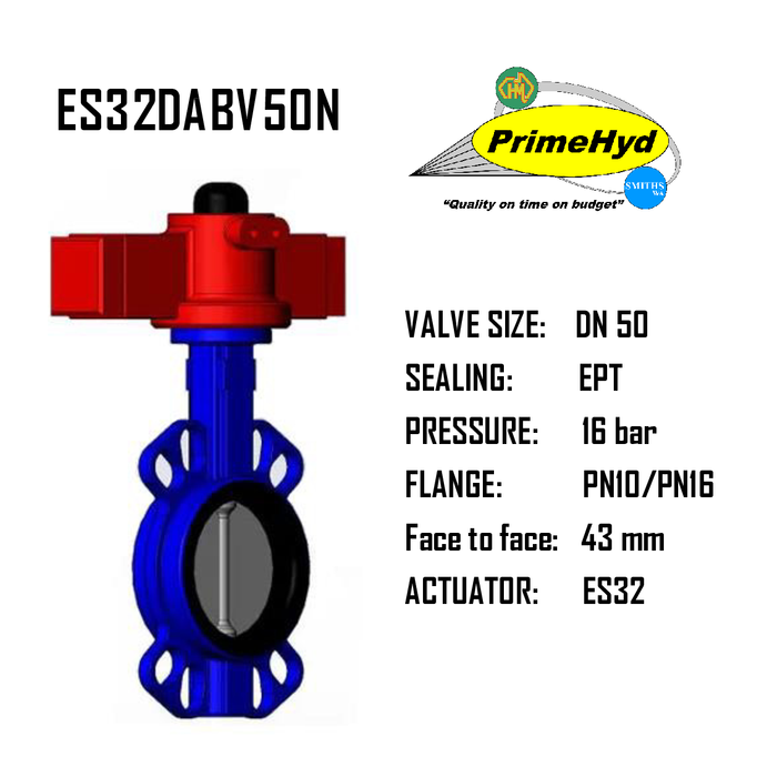 ES32DABV50N • HYDRAULIC ROTARY ACTUATOR WITH CENTRIC BUTTERFLY VALVE • TORQUE 15–23 NM • ANGLE 90° • DN 50 • PRESSURE 16 BAR • PRIMEHYD