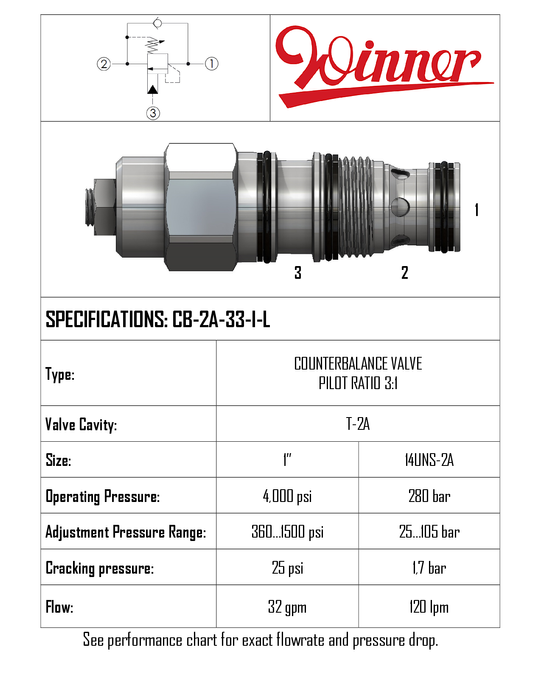 CB2A33IL • COUNTERBALANCE VALVE 3:1 PILOT RATIO • T-2A • 280 BAR (SET 25-105 BAR) • 120 LPM • WINNER