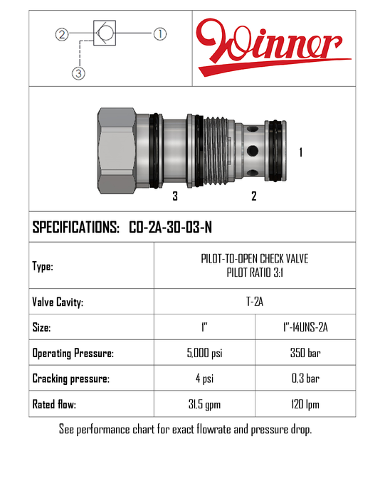 CO2A3003N • CHECK VALVE, PILOT TO OPEN • 0.3 BAR • T-2A • 350 BAR • 120 LPM • WINNER