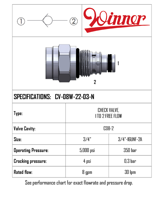 CV08W2203N • CHECK VALVE, 1 TO 2 FREE FLOW • 0.3 BAR • C-08-2 • 350 BAR • 30 LPM • WINNER
