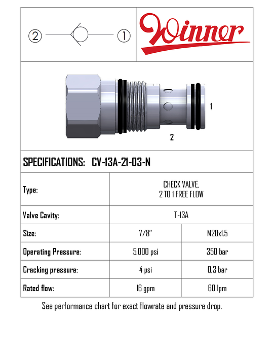CV13A2103N CHECK VALVE 2 TO 1 FREE FLOW, T-13A, SPRING 0.3BAR, 60LPM, 350BAR