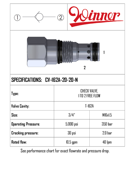 CV162A2020N • CHECK VALVE 1 TO 2 FREE FLOW • T-162A • 2.0 BAR • 350 BAR • 40 LPM • WINNER