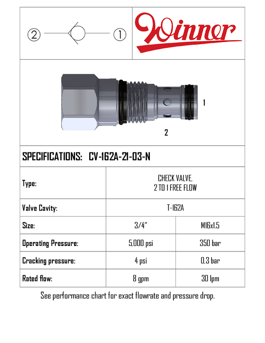 CV162A2103N CHECK VALVE 2 TO 1 FREE FLOW, T-162A, SPRING 0.3BAR, 30LPM, 350BAR