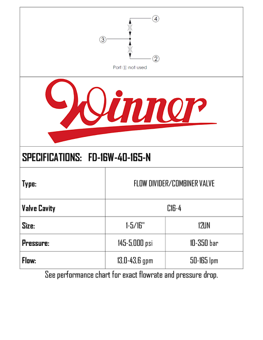 FD16W40165N • FLOW DIVIDER/COMBINER VALVE • 50:50 RATIO • C-16-4 • 350 BAR (ADJUSTABLE RANGE 10–350 BAR) • 165 LPM (ADJUSTABLE RANGE 50–165 LPM) • WINNER