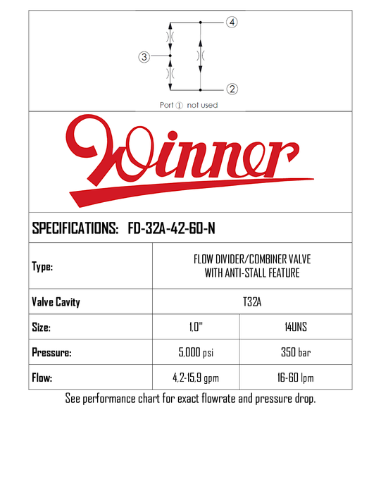 FD32A4260N • FLOW DIVIDER/COMBINER VALVE • ANTI-STALL TYPE • 50:50 RATIO • T-32A • 350 BAR • 60 LPM (ADJUSTABLE RANGE 12–60 LPM) • WINNER