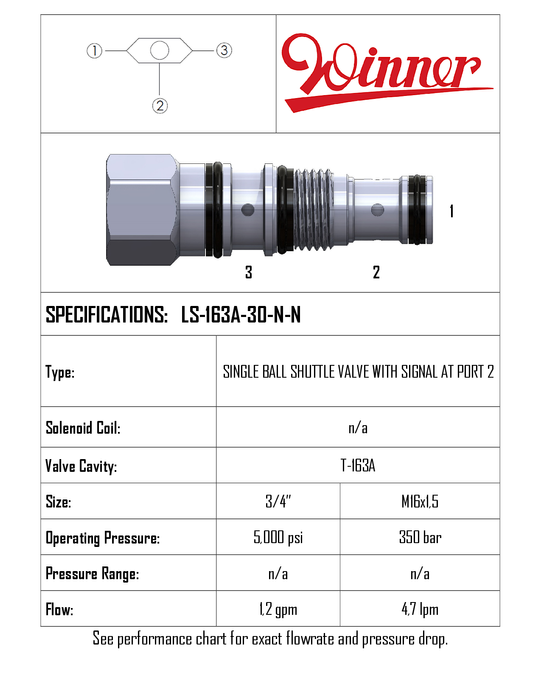 SHUTTLE VALVE SINGLE BALL SIGNAL AT PORT 2, CAVITY 163A-3, PORT SIZE N/A (CARTRIDGE), 350 BAR (5076 PSI), 4.7 L/MIN (1.2 GPM), WINNER