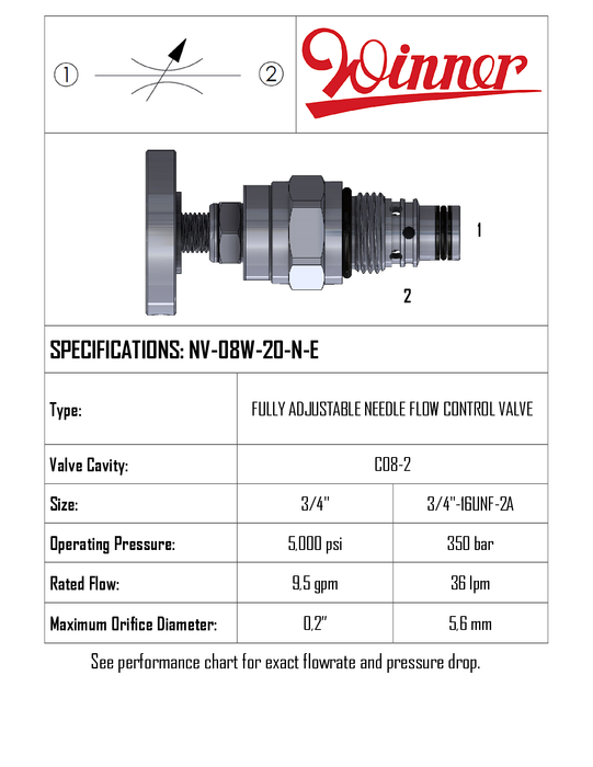 NV08W20NE • FLOW CONTROL VALVE, FULLY ADJUSTABLE, NEEDLE TYPE • C-8-2 • 350 BAR • 36 LPM • WINNER