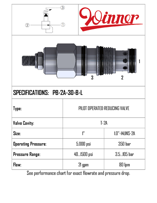PB2A30BL • PRESSURE REDUCING/RELIEVING VALVE PILOT OPERATED • T-2A • 350 BAR (3.5–210 BAR) • 80 LPM • WINNER