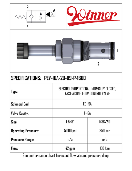 PEV16A2D09P1600 • ELECTRO-PROPORTIONAL FLOW CONTROL VALVE PRESSURE COMPENSATED • T-16A • 350 BAR • 240 LPM (0–160 LPM) • WINNER