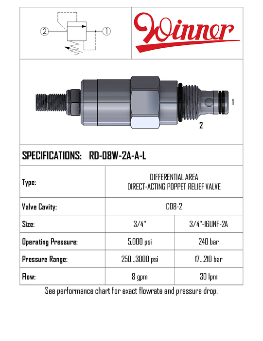 RELIEF VALVE DIFFERENTIAL AREA POPPET, CAVITY 08W-2, CARTRIDGE ONLY, 7 TO 350 BAR, 20 L/MIN (5 GPM), WINNER