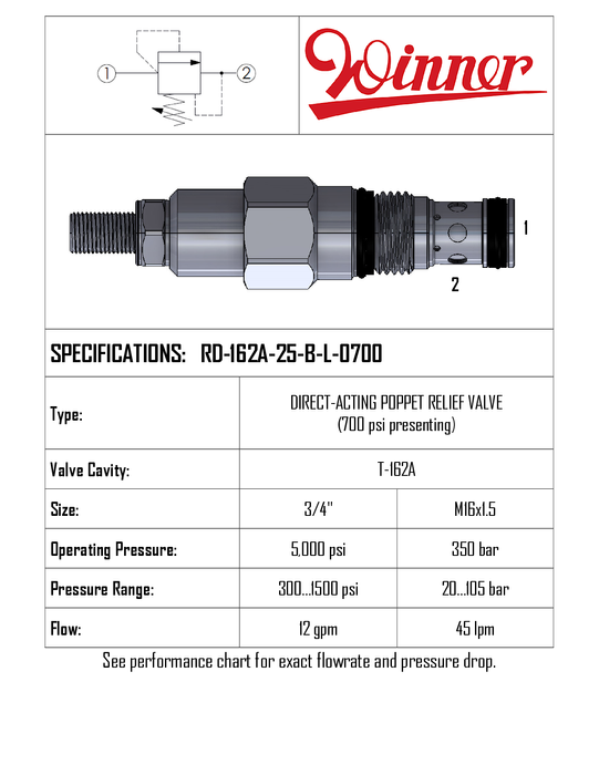 RELIEF VALVE, DIRECT ACTING, T-162A, 45 LPM, 20-105 BAR, PRESET 700PSI