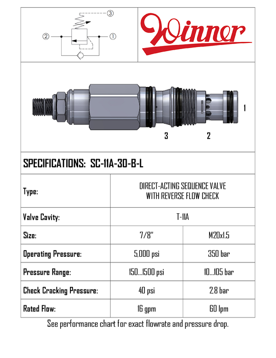 SC11A30BL • PRESSURE SEQUENCE VALVE DIRECT ACTING WITH REVERSE FLOW CHECK • T-11A • 350 BAR (20–105 BAR) • 60 LPM • WINNER