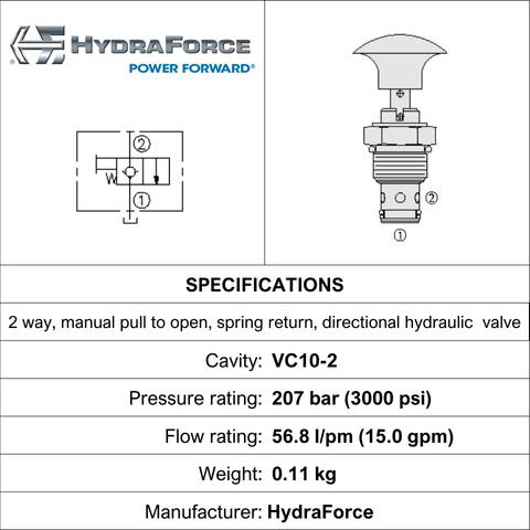 MP10-20D • MANUAL CONTROL VALVE 2 WAY MANUAL PULL TO SHIFT SPRING RETURN DIRECTIONAL HYDRAULIC VALVE • VC10-2 • 207 BAR • 56.8 LPM • D SHAPED PLASTIC KNOB • HYDRAFORCE