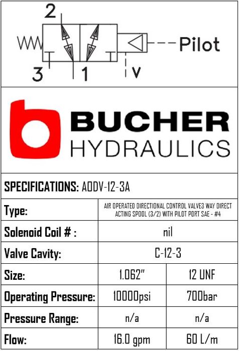 AODV-12-N-3A-04T • PILOT DIRECTIONAL CONTROL VALVE AIR OPERATED 3-WAY (3/2) SPOOL A TYPE • C-12-3 • 350 BAR • 60 LPM • BUCHER